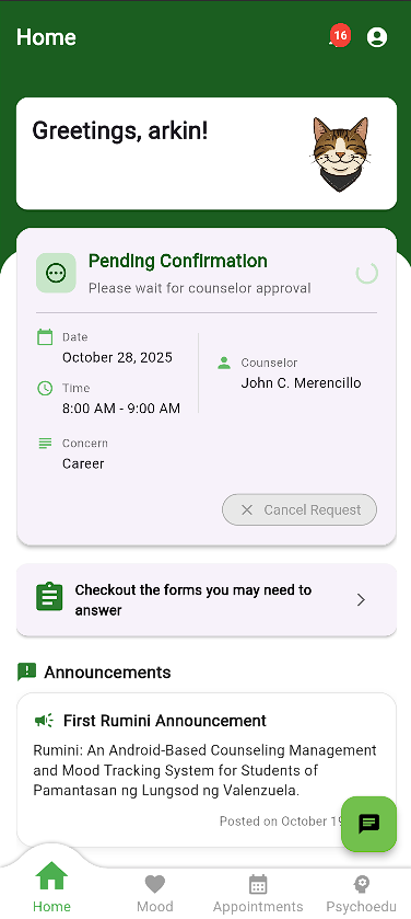 Through innovative features like mood tracking, appointment scheduling, a rule-based chatbot assistant, and psychoeducational materials, Rumini bridges the gap between students and mental health support, making counseling services more accessible and efficient.